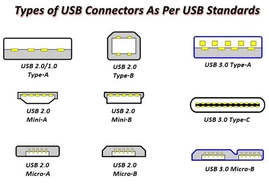 | USB 3.0 | 2008 | 5 Gbps | 4.5 W | USB-A, USB-B, Micro-USB |