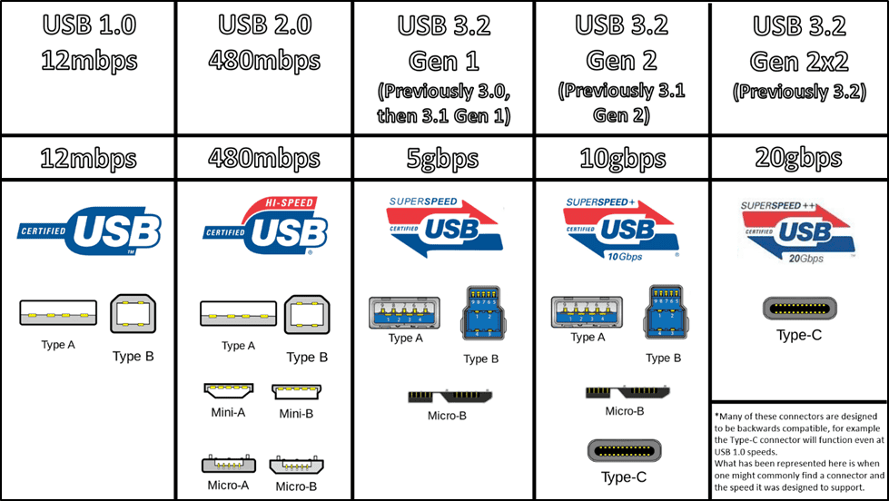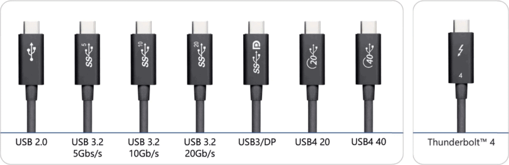 The USB 4 cable performance higher than that of cables of other USB versions. No predecessor of the USB 4 cable could support speeds of 40Gbps. USB 1.0 offered supported a max speed of 12Mbps. USB 2.0 improved this speed to 480Mbps, while USB 3.0 gave us a top speed of 5Gbps. Then came USB 3.0 with speeds of up to 10Mbps. USB 4’s immediate predecessor, USB 3.2, can only support speeds of up to 20Gbps, which is half the speed supported by USB 4. Have a look at the figure below.